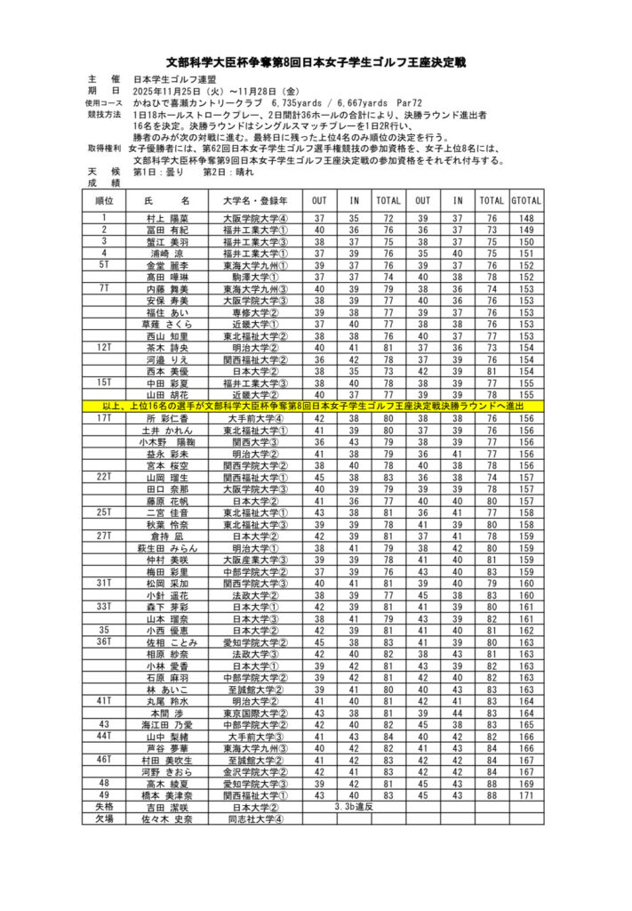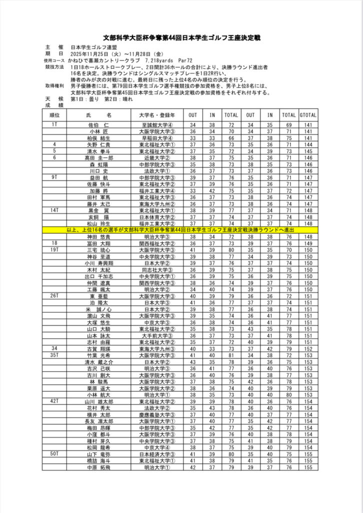 11月25~28日にかけて、沖縄県のかねひで喜瀬カントリークラブにて文部科学大臣杯争奪第44回日本学生ゴルフ王座決定戦・第8回日本女子学生ゴルフ王座決定戦がおこなわれました。